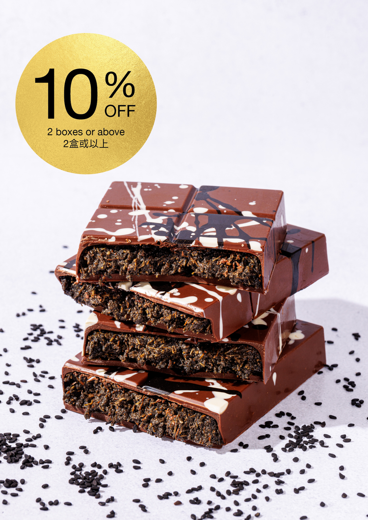 Premium black sesame from Japan is artfully blended with a hint of French almond to create a comforting, earthy flavour. This mixture is combined with crispy golden kadayif and encased in a glossy, cracking Valrhona milk chocolate shell.